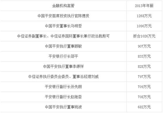 【豪门世族全球视野Ÿ金融圈那些事专题导读:2013年年报披露收官,“高富帅”的金融业高管薪酬再成话题。随着银行业整体业绩增速放缓,净利润增速普遍降至20%以内,上市银行高管“荷包”变薄;而随着上市业务普遍回暖,券商们也毫不吝啬地与高管、员工们分享了成果,券业2013年“荷包”满满。】 2013年年报披露收官,“高富帅”的金融业高管薪酬再成话题。 在这一年,随着银行业整体业绩增速放缓,净利润增速普遍降至20%以内,上市银行高管“荷包”变薄,16家上市银行中,高管薪酬总额较上年减少的达到13家;而上市券商业务受到市场交易活跃提振,业绩普遍回暖,券商们也毫不吝啬地与高管、员工们分享了成果,券业2013年“荷包”满满。 前十位平安系包揽八席 陈德贤1268万成“打工皇帝” 从高管个人薪酬排行榜单来看,财力雄厚和业绩稳健的平安系对高管最为“慷慨”。在收入排行前十名中,中国平安和平安银行的高管就包揽了八个席位,并且雄踞冠亚军,可谓“完胜”。 数据显示,金融高管薪酬冠军由中国平安首席投资执行官陈德贤摘得,他在2013年获得薪酬1268万元,中国平安董事长马明哲以1090万元年薪紧随其后。 中国平安执行董事顾敏、李源祥、姚波以907万元、828万元和682万元分列第4、第6和第10位。而同为平安系的平安银行行长邵平、副行长孙先朗及赵继臣3人位列前十,去年年薪分别为833万元、709万元和708万元。 剩余的两个前十席位则均为券商行业巨头中信证券的高管。中信证券副董事长、中信证券国际董事长兼行政总裁殷可去年获得的港币年薪折合成人民币约为1026万元,排名第三,较2012年增长28%,连续三年蝉联上市券商高管薪酬榜榜首。而中信证券另一位高管执委会委员、董事总经理刘威以797万元的年薪位列第7。 除了平安系和中信证券外,去年年薪在500万元以上的金融机构董事长还有新华保险董事长康典(598万元)、民生银行董事长董文标(531万元)等人。 从金融机构合计发放的高管薪酬总额来看,从多到少的总体排序大致是保险、银行、券商和信托。 保险行业除了中国人寿高管薪酬较低,总额仅为1350万元,无高管薪酬过百万外,其余三家保险公司的高管薪酬总额均处于较高水平。中国平安、新华保险和中国太保的高管薪酬总额分别为9438万元、6317万元和3473万元。 而紧随其后的银行和券商高管薪酬总额均值分别为2943万元和2473万元。平安银行、民生银行和招商银行的高管薪酬总额排名上市银行前三位,中信证券、广发证券和宏源证券位列上市券商前三位。信托业的三家上市公司则普遍薪酬低迷,安信信托、陕国投A和爱建股份的高管薪酬总额仅为1003万元、742万元和312万元。 一位金融行业的高管表示,上市企业年报中的高管税前年薪统计并不能反映金融机构高管薪酬水平的全貌。 比如,不少金融机构的高管并不在上市公司领取薪酬或部分在上市公司领取薪酬,还有少数金融机构则已经进行了股权激励,例如去年薪酬发放总额不高的北京银行、南京银行、宁波银行已经在2006年至2007年实施了股权激励方案。 光大证券净利大幅下滑 薪酬不减反增 从薪酬发放趋势来看,银行高管的“荷包”去年是变薄了,而券商高管则“荷包”增厚。 受股票市场交易活跃、融资融券等资本中介创新业务的提振,2013年的业绩普遍回暖,券商营业收入和净利润扭转了连续3年的下滑趋势,而上市券商净利润增幅更是达到三成。在行业业绩整体好转的局势下,券商们也毫不吝啬地与员工分享了成果。 在19家上市券商中,仅山西证券、西部证券、西南证券、招商证券和东吴证券5家券商高管薪酬总额有所下滑,其余均有不同程度增幅,其中以东北证券为尤,其2013年高管薪酬发放总额较上年猛升85%,而这与其219%的净利润增幅也相应匹配。薪酬总额增幅68%的方正证券也获得97%的净利润增幅。 德勤高管薪酬研究中心近日发布报告称,各家券商在2013年业绩回暖的情况下,对高管和员工的回报也相应提升。大多数券商的高管薪酬与业绩挂钩紧密,呈现较为一致的变化趋势。 值得一提的是,光大证券由于受“8·16事件”的影响,成为唯一一家去年业绩下滑的上市券商,降幅达到79%,但其高管薪酬不降反增,去年合计发放3001万元,较上年提升18%。 2014年1月22日起任职的总裁薛峰在2013年领取薪酬243.27万元,因“8·16事件”离职的徐浩明、刘剑、杨赤忠和梅键去年年薪分别为239万元、163万元、145万元和132万元。