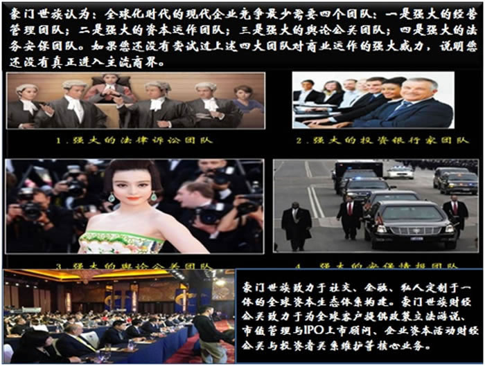 豪门世族认为:全球化时代的现代企业竞争最少需要四个团队:一是强大的经营管理团队;二是强大的资本运作团队;三是强大的舆论公关团队;四是强大的法务安保团队。如果您还没有尝试过上述四大团队对商业运作的强大威力,说明您还没有真正进入主流商界。