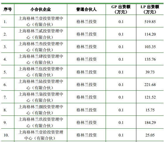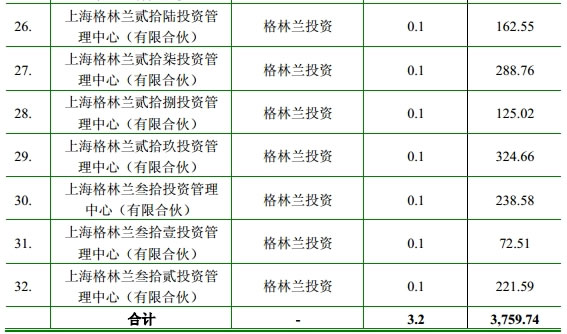 ![]() 四、下图为从“壹有限合伙”到“三十二有限合伙”等一系列小有限合伙安排的具体细节。在每一个小的有限合伙安排中,格林兰投资作为普通合伙人(GP),只象征性出资1000元即获得了管理权。这样,在一共32个小有限合伙安排中,格林兰投资累计出资额只有区区3.2万元。即,格林兰投资以3.2万元控制了3759.74万元的员工持股权。这是关键安排的第一步。