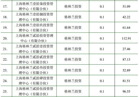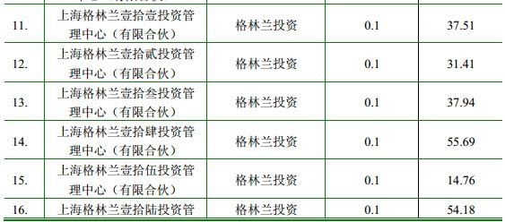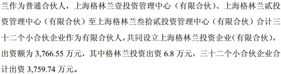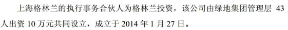 ![]() ![]() ![]() ![]() 五、在此基础上,以32个小有限合伙安排为有限合伙人(LP),格林兰投资作为普通合作人(GP),出资6.8万元(注册资本10万元,其余的3.2万元已经作为对32个小有限合伙安排的出资),成立了大的有限合伙安排“上海格林兰”。这是关键安排的第二步:张玉良通过注册资本仅有10万元的格林兰投资,控制了3766.55万元的内部人持股权。
