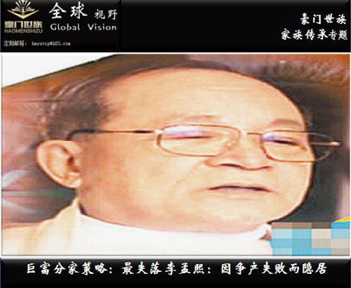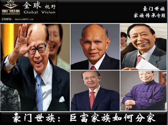 2012年5月26日,现年83岁的“亚洲第一富豪”李嘉诚终于为他的完美人生埋下最后伏笔,将价值约250亿美元的财富帝国分属两子,延续李氏家族的二代财富传奇。 自古以来,对于有着深重的家族观念的中国人,分家是一件重要而令人痛苦的事。尤其是那些富豪家族,以“亿”做计量单位的家产该如何分割?谈钱如何才不伤感情?这恐怕不太容易。李嘉诚、何鸿燊、王永庆,港澳台三位同时代叱咤风云的大佬,分家却有着不同的结局。 首富李嘉诚家族分家策略:摇钱树和钱,二选一;看点:投其所好,大家好才是真的好! 李嘉诚到底有多少钱?估计连他本人也算不清楚。 李嘉诚的产业需要用大型树状图来表述,因为除长江实业、和记黄埔、电能实业、长江基建四大集团外,其下属投资公司不计其数。 根据《福布斯》2012年初公布的信息,李嘉诚的身家多达255亿美元,全球排名第九,连续多年稳居华人首富宝座。但《福布斯》也在随后发布消息称,Facebook的上市或使李嘉诚身家暴涨8亿美元。 按照李嘉诚的分配方案,长子李泽钜继承衣钵,获得超过40%的长江实业及和记黄埔的股权以及加拿大最大能源公司赫斯基35%的股权。 这三大资产无疑是李氏帝国的财富核心,堪称全球最金光熠熠的摇钱树。 以低调沉稳著称的大公子李泽钜似乎为家族而生,遵照父亲意愿选择美国斯坦福大学土木工程专业,毕业后又顺从父意加入长江实业及加拿大籍,并娶了贤淑美妻,成为罕见的豪门“不粘锅”丈夫。 现年48岁的李泽钜“继位”毫无争议。不足30岁,他已管理市值541亿美元的商业帝国,两年后,他以25倍认购额的骄人成绩完成长江基建的分拆上市,让李嘉诚高呼满分。同时,他还控制着欧洲第三代移动电话网和世界最大的港口运营业。2009年,李泽钜又下注加拿大航空公司,成为最大单一股东,并拿下素有“暴利奶牛”之称的石油巨头赫斯基。 如果完美也能遗传,李泽钜显然继承了父亲的基因。李泽钜将父业送上市并开拓全新的加拿大及欧洲财富版图,他谦和、周全、稳健,是100%的二代“太平绅士”。 对于46岁的次子李泽楷,李嘉诚许以重金,全力支持其收购心仪的公司,这个安排显然很符合李泽楷“不愿拼爹”的风格。 25岁,李泽楷已能强势对战62岁的传媒大亨默多克,以7倍溢价出售StarTV。5年后,他自立门户——打造3亿变600亿的高科技概念股,并空手套得亿万地产,赢得“小超人”美誉。 桀骜不驯的李泽楷向来不走寻常路。他不顾父亲劝阻,强力与“发明大王”黄金富对抗,甚至涉嫌误导证监会,引发“种票疑云”,遭警方搜查。 这位性情中人的情史也段段高调精彩,前女友包括大法官之女、日籍主播、社交名媛、混血律师等,2008年,李泽楷豪掷1亿为混血影后梁洛施赎身解约并未婚生子,四年后,又不惜付5亿分手费换回自由身。 面对性格迥异的两个儿子,李嘉诚聪明地拿出投其所好的财产分配方案,让二人都表态:“OK!” 赌王何鸿燊家族分家策略:四房平分、神秘和解;看点:老婆太多,上演《宫心计》。 如果风流赌王何鸿燊能早点想到老婆太多,分家麻烦,不知道他还会不会肆意享受温柔无边。 何鸿燊控制的资产达5000亿港元之巨,个人财富有700亿港元(约90亿美元),他所控制的澳门旅游娱乐有限公司(下称“澳娱”)主宰澳门博彩业长达40年之久,何鸿燊也因此成为澳门博彩史上权势最大、获利最多、名气最响、在位最长的赌王。 何鸿燊还涉足房地产、金融、运输、酒店等多个领域,他执掌的数十家公司几乎包揽了澳门的所有重要行业,有统计称,澳门有1/3的人直接或间接受益于他的公司,因此他被称作“无冕澳督”。 商场叱咤风云,情场一样得心应手,何鸿燊从不介意外界称他为“一代情圣”,仅他公开承认的情人就多达数十位,娶回家的四房太太也个个貌美如花,精明能干。 2010年底,90岁的赌王因身体原因屡报病危,分家终于被提上日程。澳娱是赌王的核心资产,何鸿燊通过公司持有澳娱26.8%的股份,并以个人名义持有澳娱4.8%的股份,为澳娱最大单一股东,这意味着谁拿到了更多家产,谁就是新一代赌王。 2011年1月24日,澳娱宣布何鸿燊持有股权的50.55%分与三房陈婉珍所有,其余49.45%的股权由二房蓝琼缨的5名子女平分。 股权变动后,三房陈婉珍及子女占有澳娱约8.91%的股份。而二房蓝琼缨之前已透过信德集团持有澳娱近11.4%的股份,加上分得的家产,二房直接或间接占有澳娱14.8%股份,四房梁安琪在一个月前由何鸿燊直接转予7.63%澳娱股份。 至此,二房蓝琼缨及其子女成为最大的赢家,三房次之。 一天后,声称代表何鸿燊的律师指控二房及三房在诈取资产,分家文件并非赌王签署,争夺家产战正式拉开序幕。 此后两个月,何鸿燊的三房妻子(大房已去世),17个子女都纷纷卷入战争,出示证据,与何鸿燊交涉,最终在2011年3月达成和解,但财产分配方案始终成谜。何家人曾对外宣称,家产四房平分。 现今,何鸿燊四个长房子女已各有发展,在地产和雕塑上颇有建树;二房及五个子女实力雄厚,在地产、运输、博彩业持有大额股份;三房陈婉珍及三个子女行事低调,经营古董、运输和地产业务,拥有小额博彩股份;四房梁安琪成为商界女强人,带领五个子女涉足饮食、房产、证券、休闲度假等多个领域,并任职澳娱高层。 不难猜测,“分家谜团”最后的赢家——四房梁安琪。 新的赌王诞生了,而且是女赌王。 经营之神”王永庆家族分