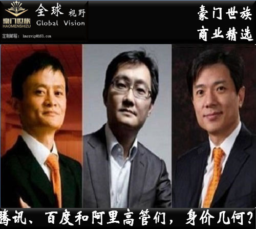 伴随着BAT崛起的,是其三大“教主”的财富火箭式增长。腾讯“教主”马化腾,2014年位列“新财富500富人榜”第四名。虽然名次与去年保持一致,但其财富却近乎翻倍。BAT另外两位“教主”——百度的李彦宏、阿里巴巴的马云也紧随其后,分别位居2014年“新财富500富人榜”第5位及第7位。 究竟是时代成就英雄还是英雄造就时代?这是一个永远没有答案的问题。他们从1998年前后开始空手创业,到目前俱拥有数百亿甚至近千亿元的财富,时间跨度不过短短十余年,此财富增长速度远非其他传统行业的富人所能企及。遥想“三教主”创业之时,谁敢憧憬自己十余年后能成为中国首富级人物? BAT三巨头皆有多位联合创始人,他们被外界冠之以江湖气十足的头衔:“腾讯五虎将”(马化腾、张志东、曾李青、许晨晔、陈一舟),“百度七剑客”(李彦宏、徐勇、刘建国、郭眈、雷鸣、王啸、崔珊珊),“阿里十八罗汉”(马云、孙彤宇、蔡崇信、彭蕾、张瑛等)。 “三教主”于2004年首次进入“新财富500富人榜”,当年李彦宏的财富为10亿元(第156位),马云的财富为5.3亿元(第284位),马化腾的财富为3.5亿元(第398位)。及至2014年,三人财富分别达到608亿元、457亿元、739亿元(2013年12月31日市值数据),各自财富分别增长了60倍、86倍、210倍。