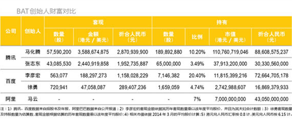 对于已经上市的腾讯、百度,其创始人皆进行了不同程度的套现,要精准计算其财富并非易事,而且有些联合创始人的持股数量并未完全披露,因而我们只能选择其中部分创始人进行相对精确的计算。而至今未上市的阿里集团,由于公开资料有限,马云是否进行过套现不详(已退市的阿里巴巴网络有限公司(01688.HK)在香港上市期间,马云曾于2009年9月高位抛售1300万股,套现约2.7亿港元),其财富数额在某种程度上也是根据公开资料进行大致的估算。 我们依据2014年3月份的平均股价(或估值),计算了BAT主要创始人最新的财富状况。