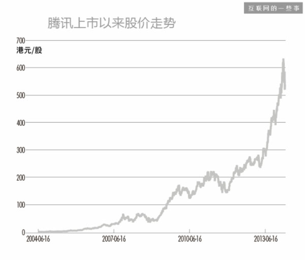 腾讯:马化腾持股市值886亿元,累计套现28.7亿元 2004年6月16日,腾讯于港交所完成IPO,发行价3.7港元/股,此后其股价一路上扬,及至2014年3月7日达到突破646港元/股的历史最高位,股价累计上涨了174倍(图2)。腾讯2013年年报披露,马化腾持股数量为1.9亿股(占比10.2%),如果按照2014年3月份的平均股价计算,其当月持股市值约为1107.6亿港元,折合人民币886亿元。