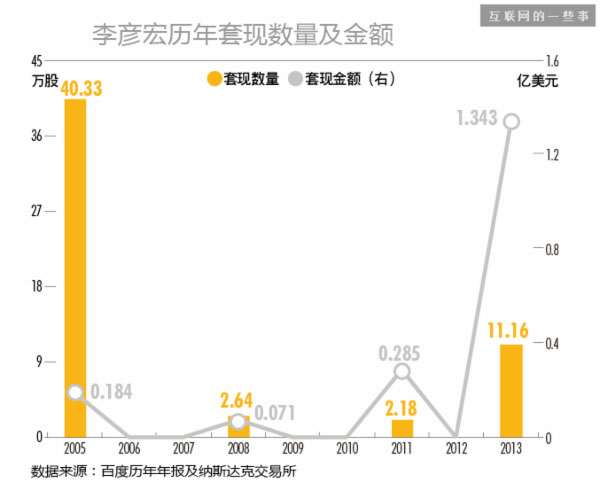 另外,根据百度历年年报披露的数据,李彦宏自百度上市以来累计套现了56.31万股,根据其历年平均股价,估计其套现总金额约为1.88亿美元,折合人民币约11.58亿元。相较而言,李彦宏的套现规模远不及马化腾。 其实,李彦宏在百度上市后的多数年份皆未做任何套现,即便有,也只是少量的。其套现数量最多的一次是在百度IPO当年,总计抛售了40.33万股,套现金额约为1840万美元。其中,李彦宏在百度IPO时以招股价配售了25万股,套现675万美元;马东敏于2005年抛售了15.33万股,套现约1168万美元。