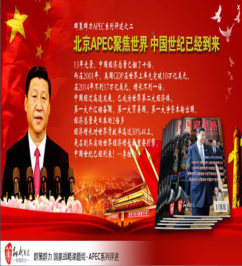 文/群策群力国家战略课题组李桂松、李繁君、李嘉仪 导言:中国新型智库群策群力国家战略课题组基于中国综合国力和国际地位的大幅提升以及APEC作为国际盛会的重要战略意义,特推出了2014北京APEC系列评述,从大国形象、大国实力、大国领袖、大国体制四个方面进行全面论述,得出了:“习近平正带领中国人民走在中华民族伟大复兴实现中国梦的伟大征途上,正带领中华儿女走在世界舞台的正中央。只有中国共产党才能救中国,只有中国共产党才能领导和发展中国。历史正在证明并最终证明只有中国共产党领导和发展的强大中国才是世界和平与发展的定海神针”。 群策群力APEC系列评述之一:北京APEC聚焦世界 大国形象傲然东方 群策群力APEC系列评述之二:北京APEC聚焦世界 中国世纪已经到来 群策群力APEC系列评述之三:聚焦APEC大国领袖 习近平新政与中国崛起 群策群力APEC系列评述之四:聚焦APEC大国体制 中国共产党为什么能 正文: 北京APEC峰会聚焦世界,中国世纪已经到来!举世瞩目的为期4天的党的十八届四中全会刚刚举行闭幕会。听取和讨论了习近平受中央政治局委托作的工作报告,审议并通过了《中共中央关于全面推进依法治国若干重大问题的决定》,在今秋11月又迎来了举世瞩目的国际盛会—2014北京 APEC峰会再次凝聚世界关注的目光。既2001年上海APEC会议时隔13年APEC又重新回到了中国,亚太经合组织第二十二次领导人非正式会议将于11月10日至11日在北京召开。这次会议主题为“共建面向未来的亚太伙伴关系”,20多个国家的亚太经合组织经济体首脑人物或代表将应邀与会。国家主席习近平将出席并主持会议。一个无与伦比的中国世纪在中国梦与世界梦相融合,在以北京为主导的APEC大幕下已经徐徐展开,中国世纪已经到来。 十三年前的上海,亚太经合组织各成员领导人的一袭唐装,让APEC在普通百姓心中烙上了浓郁的中国印记。此后,唐装伴随着该次会议的丰硕成果在世界的目光里,从容地展示着东方文化的个性与魅力。历史的指针划过十三年之后,这个业已成为全球极具影响力的区域国际组织峰会再度叩响中国的大门。今秋,距离北京城区50公里的雁栖湖,将再次聚焦世界的目光。 2001年中国全国国内生产总值(GDP)已突破9万亿元人民币大关,达到9.58万亿元人民币。如果按当年现行汇率折算,国内生产总值超过1.1万亿美元,成为世界上第六个经济总产量超过1万亿美元大国。而在2014年的今天,如果按中国经济总量在2013年约合9.3万亿美元基础上7.5%左右的增速,2014年将大大突破10万亿美元。与美国并成全球仅有的两个超越10万亿美元规模级别的主要经济体。13年光景,中国经济总量已然翻了十倍。而在2001年,美国GDP在世界上率先突破10万亿美元,在2014年不到17万亿美元,增长不到一倍。中国经过高速发展,已成为世界第二大经济体,世界第一大外汇储备国,世界第一大贸易国,世界第一大净资本输出国,经济总量是日本经济总量的2倍多,经济增长对世界贡献率达到30%以上,是名副其实的世界经济增长最重要引擎。是全球经济援助、全球经济投资和全球经济增长最重要增长国。 13年光景,美国在经历了9.11,借反恐之名入侵阿富汗、伊拉克、叙利亚等国以及2008年的次贷危机所引发的全球金融海啸和2010年的欧债危机之后,世界三分天下格局已成。2010年中国超越日本跃居世界第二大经济体。2013年,中国经济总量已成为第三大经济体日本的两倍。2012年中国经济总量首次超过美国一半。2014年中国经济总量突破10万亿美元,这将意味着与美国经济总量差距进一步缩小。另外,中国经济总量已于2013年超过了整个欧元区。不过,尽管中国GDP将大大突破10万亿美元,但其人均GDP与发达国家依然相距甚远。这意味着,中国长期处于社会主义初级阶段的现实没有改变,中国依然是世界最大发展中国家的国际地位也没有改变。然而,中国的大国形象和对世界负责人的国际形象已在全球不可替代。 据外交部长王毅介绍,北京APEC合作倡议一半以上由中国贡献。2014年10月29日,外交部举办第十届“蓝厅论坛”,外交部长王毅发表题为“北京APEC:中国准备好了!”的主旨演讲。王毅称,此次APEC会议将“共建面向未来的亚太伙伴关系”定为今年的主题,将“推动区域经济一体化”,“促进经济创新发展、改革与增长”,“加强全方位基础设施与互联互通建设”定为三大重点议题。预期会议有望在三个主要方向上取得新的突破:一是启动亚太自由贸易区进程,迈出区域经济一体化新步伐;二是明确经济改革、创新增长等五大支柱领域,发掘亚太经济未来新动力;三是着眼联动发展,勾画亚太全方位互联互通新蓝图。王毅说,在促进区域经济一体化,推动经济创新、发展与改革,互联互通这三大议题中,中国提出了很多重要的,也得到各方支持的倡议。例如,启动亚太自贸区的进程,制定互联互通蓝图等。王毅指出,中国还首次倡导在APEC平台上开展全球价值链、互联网经济、城镇化等新领域的合作。这100多项合作倡议,将加强APEC地位,为今后发展注入活力,并对未来亚太地区经济合作产生深远影响。 群策群力首席研究员、国家战略课题组组长李桂松认为,随着十八届三中全会习近平主席上台之后,在中华民族伟大复兴的中国梦的伟大旗帜下,中国在政治、经济、文化、外交、军事等领域已发生重大改变。中国