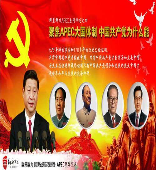 无可争辩的事实和170多年的历史已经证明,只有中国共产党才能救中国,只有中国共产党才能领导和发展中国。历史正在证明并最终证明只有中国共产党领导和发展的强大中国才是世界和平与发展的定海神针。—李桂松 文/群策群力国家战略课题组李桂松、李繁君、李嘉仪 导言:中国新型智库群策群力国家战略课题组基于中国综合国力和国际地位的大幅提升以及APEC作为国际盛会的重要战略意义,特推出了2014北京APEC系列评述,从大国形象、大国实力、大国领袖、大国体制四个方面进行全面论述,得出了:“习近平正带领中国人民走在中华民族伟大复兴实现中国梦的伟大征途上,正带领中华儿女走在世界舞台的正中央。只有中国共产党才能救中国,只有中国共产党才能领导和发展中国。历史正在证明并最终证明只有中国共产党领导和发展的强大中国才是世界和平与发展的定海神针”。 群策群力APEC系列评述之一:北京APEC聚焦世界 大国形象傲然东方 群策群力APEC系列评述之二:北京APEC聚焦世界 中国世纪已经到来 群策群力APEC系列评述之三:聚焦APEC大国领袖 习近平新政与中国崛起 群策群力APEC系列评述之四:聚焦APEC大国体制 中国共产党为什么能 正文: 历史已经证明只有中国共产党才能救中国,只有中国共产党才能领导和发展中国。事实已经证明中国共产党不仅能领导和发展中国,并且是比其他国家的政党发展得更快更好。6800多万中共党员领导了世界上13.7亿人口大国,不但解决了让世界担心的吃饭问题,还让老百姓过上了富裕幸福的安康生活。中国不但没有“国强必霸”,更开创了全新的外交理念:人类命运共同体、人类利益共同体和人类责任共同体。不但能够举办无与伦比的2008北京奥运会,举世瞩目的2010上海世博会和全球聚焦的2014北京APEC峰会,还在以美国次贷危机所引发的全球金融危机、欧债危机所引发的世界性经济衰退背景下,中国经济依然保持快速增长并引领世界经济一路向前。中国的强大不但没有成为世界的威胁,更成为世界和平与发展的定海神针。中国的法治建设、中国的内政外交、中国的反腐强军、中国的全球投资与全球援助无不令国际社会对中国共产党所领导的中国刮目相看。“中国模式”、“中国道路”、“中国经验”等等成了国内外许多人探讨的问题。一些有识之士在思考,中国共产党为什么能?为什么中国共产党能取得如此辉煌的执政成就?中国道路和中国模式为什么在西方口诛笔划和经济、军事与外交围堵中反而愈显魅力,朝气蓬勃和生机活力? 10月29日国家主席习近平在人民大会堂会见博鳌亚洲论坛理事会工作会议代表时指出,中国发展同亚洲命运息息相关。亚洲国家合作之路宽广,发展前景看好。亚洲国家应该坚持联合自强,互利合作,包容开放,实现共同发展繁荣。中国坚定不移走和平发展道路,践行亲、诚、惠、容的周边外交理念,奉行开放的区域主义。我提出建设丝绸之路经济带和21世纪海上丝绸之路的倡议,目的是共同打造沿线区域经济一体化新格局。一个不断发展的中国必将为亚洲发展作出更大贡献。 90多年来,世界见证了一个东方红色国度的蔚然崛起;90多年来,世界见证了中华民族的坎坷复兴之路。90多年来,对中国和世界社会主义国家而言都是一个里程碑,不仅让世界看到了灿烂耀眼的成就,更见证着一个社会主义在新世纪新形势下去创造一个又一个的辉煌,从一个胜利走向另一个胜利。 据世界银行统计,1980-2012年,中国GDP年均增长速度达到10%,对世界GDP增长的贡献率高达13.4%。在同期全球经济3.2%的年均增速中,0.42个百分点来自中国。中国经过65年的建国已经成为世界第二大经济体,世界最大的外汇储备国,世界最大的贸易国,对世界贸易贡献率已达30%以上,今年已成为资本净输出国,成为全球投资与经济增长的巨大引擎。而奥巴马政府一个任期内,国债规模就从大约10万亿美元暴增至超过16万亿美元。相比高速增长的债务规模,美国财政能力却并未随之增加。无可争辩的事实和170多年的历史已经证明,只有中国共产党才能救中国,只有中国共产党才能领导和发展中国。历史正在证明并最终证明只有中国共产党领导和发展的强大中国才是世界和平与发展的定海神针。中国共产党所领导的中国开创了全人类最伟大的事业—中国特色社会主义;开创了全人类最伟大的和平外交理念—人类利益共同体,命运共同体,责任共同体,为世界和平与发展指明了正确发展的航向。 中国共产党永葆青春活力的理论体系:马列主义、毛泽东思想、邓小平理论、三个代表、科学发展观以及习近平系列讲话精神在历史的每一个关键时刻都创造了光明灿烂的未来。在共产党出现之前,中国面对东西方列强的侵略从来没有成功的英雄,从来只有悲剧的英雄。他们奋斗了,他们牺牲了,但他们谁也没能够改变中国任人宰割的命运:从林则徐、魏源的“睁开眼睛看世界”,到李鸿章、曾国藩的“洋务运动”,从康有为、梁启超的“戊戌变法”,到孙中山领导的辛亥革命,历经一次次的失败。唯有十月革命一声炮响,给中国送来了马克思列宁主义。1921年,中国共产党应运而生。共产党毛泽东扭转了乾坤,中国人从此站立起来了,彻底改变了中国“人为刀俎,我为鱼肉”的命运。在毛泽东领导下中国人顶住了一切外来干涉。即使世界上头号超级大国美国也