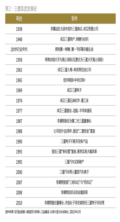 三星电子是三星集团的旗舰企业,其2012年聘用23.6万名员工,销售额为1878亿美元,占集团销售额的70%,净利润为206亿美元。2013年,三星电子跻身世界500强第14位(2012年排名第20位),三星生命保险也入围并排名第427位。此外,三星还与法国雷诺、日本东芝和索尼等公司有合资企业。在InterBrand的2013年全球最佳品牌排名中,三星以396.1亿美元的价值排名第八位。 这间家族企业由李秉喆在1938年创办,目前的会长是创始人的三子李健熙,其2013年以130亿美元的净资产排名福布斯全球富豪榜第69位,并长期占据韩国首富的位置。而由于第三代接班计划的实施,李健熙唯一的儿子李在镕作为三星的继承人,已悄然成为韩国第三大富豪。 在三星集团70多年的发展中,李氏家族与之风雨共济、共同成长。而无家族办公室(FamilyOffice,FO)之名、行FO之实的三星集团秘书室,则对集团的集权管理和家族治理发挥了决定性作用。秘书室担任着李氏家族大管家的角色,帮助家族凝聚权力,集中管理分布在世界各地的子公司,并协调企业和家族之间的利益。 李健熙秘书室的历史源流 秘书室的概念来源于日军二战时的参谋组织。战后,原关东军司令部主任参谋和大本营陆海军参谋濑岛龙三出任伊藤忠商事会长,将这一组织带入伊藤忠,主要负责商业情报收集、组织参谋等工作,从而在日本商社中引发设立秘书室的潮流。深受日本影响的李秉,则将这一潮流带入了韩国。 李秉于1938年成立三星集团前身——三星商会,主要进行水果和干鱼的出口(表2)。二战后,韩国政府邀请濑岛龙三为其发展献策。濑岛龙三说明了商社的重要性,建议韩国借此拉动出口。韩国由此大力提倡“综合商社模式”,将一些贸易公司合并为大型综合商社,三星也于1951年成立三星Moolsan(现为三星物产)——其被政府指定为“综合贸易商社1号”,成为韩国综合商社的先驱和样板。1959年,三星的秘书室也在濑岛龙三和李秉的引领下成立了。起初,秘书室是三星物产下的一个“课”(等同于中国的科级部门),只有20人,帮助会长处理日常事务。