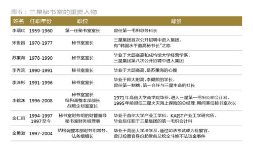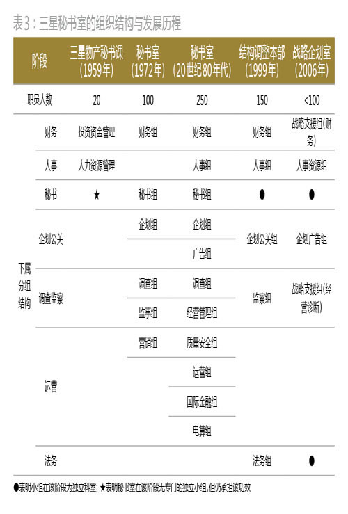 到了20世纪60年代,三星进行大量并购,分别收购了东方生命保险(以后的三星生命保险)、东花百货、世韩造纸等机构,并于1969年成立了三星电子与三星电机。70年代,三星则开始多元化发展,专注于投资重工、化学等领域,分别成立了三星重工、三星石油化学、三星精密化学、三星造船等子公司,三星半导体和三星电子也开始发力出口全球,开拓国际化战略。此时三星已发展成为一家多元化经营的跨国企业。 在三星的管理上,李秉把所有的日常事务交给下属,自己只做战略性的决策。同时,作为一家多元化经营的公司,三星子公司遍布世界各地,并且实施独立经营制度,需要一个强大的参谋组织作为内部的协调者,收集信息后做出企划和调整。于是,李秉参考三菱、三井和住友等日本财阀的秘书组织经验,于1972年加强了秘书室的功能,令其担负情报收集和分析、企划、日常事务管理等辅助功能(表3)。