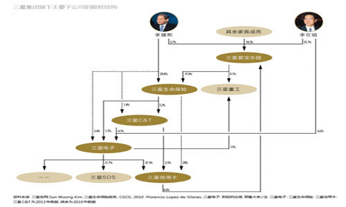 根据金勇澈在《三星内幕—揭开三星第一的真相》中的陈述,结构调整本部财务组通过精心设计的复杂运作,帮助李健熙完成了所有权和经营权的转移。 1994年,李在镕从父亲手里获得61亿韩元的起始资金,在支付16亿韩元的财产赠与税后,李在镕首先购入了价值23亿韩元的安防公司三星S1(SecurityNO.1)的股票,在1996年三星S1上市后,其获利273亿韩元。之后,李在镕利用这笔资金购入三星集团多家子公司的股票,仅从三星工程和Cheil通信就分别获利250亿和133.8亿韩元。 第一步的资产增值之后,第二步就是经营权的转移,其中最为重要的是三星集团的控股公司——三星爱宝乐园。1996年,李在镕以96.2亿韩元的价格购入了125万股“私人配售可转换债券”,随即将其转为爱宝乐园31.9%的股权。1997年,李在镕以低价购入三星电子可转换债券,由此持有三星电子0.6%的股权。1998年,三星爱宝乐园通过购买三星管理人员手中的股票,对三星生命保险的股权增加到20.7%。最后,李在镕购入230亿韩元的三星SDS附认证股权债券,并在第二年使用认股权,将其持有的三星集团股权增加到25.1%。 这些交易在韩国国内引起大量非议,李健熙和爱宝乐园的两位高层被指控廉价发行爱宝乐园可转换债券、三星SDS附认证股权债券,但法院最后还是判决罪名不成立。在成为三星爱宝乐园最大股东的同时,李在镕也控制了整个三星帝国,而其中仅缴纳了16亿韩元的赠与税。 在大部分的亚洲企业里,通过金字塔持股或交叉持股结构,控股家族的控制权(表决权)通常大于现金流权。韩国财阀也不例外,其普遍通过复杂的交叉股权结构来保持控制权。在三星集团内部,李氏家族同样只持有集团子公司的少量股权,大约在1%-2%之间,却能牢固掌控整个集团(附图)。旗舰企业三星电子的最大股东是三星生命保险(持股7.7%),而三星生命保险的最大股东又是李健熙和三星爱宝乐园(分别持股20.8%和19.3%),三星爱宝乐园的最大股东是李在镕(持股25.1%),三星电子持有三星信用卡37.5%的股份,而三星信用卡又持有三星爱宝乐园8.6%的股份。通过这种交叉股权结构,李健熙和李在镕成为三星集团的实际控制人。