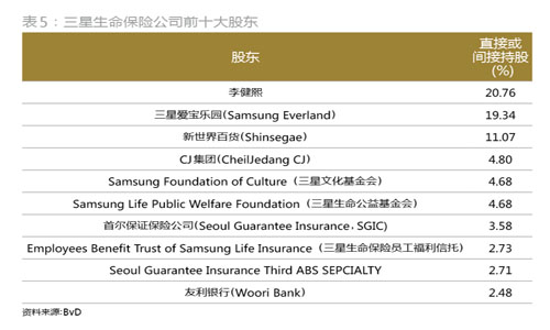 通过表5,我们可以进一步观察三星生命保险的股权结构。除了李健熙和爱宝乐园,排名第三的股东新世界百货(Shinsegae,持股11.07%)属于三星创始人李秉喆的女儿李明熙,而第四大股东CJ集团(CheilJedangCJ,原第一制糖公司,持股4.8%)由李秉的长孙李在镕掌控。由此可见,李氏家族通过控制三星生命保险和爱宝乐园,掌握了三星集团的经营权。