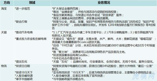 还记得2011年的“淘宝十月围城事件“吧?当时阿里出台”淘宝新规“大幅提高商家年服务费与保证金,此举引起中小商家不满而奋起反抗。2012年中旬,淘宝小二腐败现象被曝光之后,阿里进行了防腐整顿。2013年岁末,阿里对天猫、淘宝商家刷单和售假行为,严查虚假交易,不加预警的方式将诸多店铺关闭,商品下架,导致一部商家“误伤”,从而引发小范围骚动。 另一方面,商家对流量的投入成本增加,交易转化效果却远不如从前,而商家两极分化情形明显。 综合上述情况,足以反应出阿里基础(零售)电商生态已告别流量红利期的真实情况。 在过去的2014年,阿里一直没有停止对其电商生态的净化,但在方式上有所转变。 比如,阿里“打假”,已不再是单方行动,联合执法机构借用数据分析等技术手段,从商家售假交易行为扩展到源头,供应商制假打击。淘宝“扩大保证金缴纳范围”主要从C2C新品交易到二手交易,品类细分至数码3C。动态制考核“金牌卖家”的推出,意在让商家跳出拼流量、直通车烧钱的困境。但事实上,商家不可能因为一个政策的调整,而摆脱流量转化困境。据阿里2014Q3财报显示,50.46%的收入来自800万商家的广告费和服务费,所以根本上阿里基础电商盈利模式不会有大的转变。 除了打击、规范,阿里力推开拓需求增量市场,以图打破“僧多粥少”。需求增量,虎嗅概括出阿里两大动向,其一是品类梳理深挖,其二是渠道下沉,重推农村电商。 先看类目梳理,阿里挖来了GXG“千万姐”李淑君负责服饰类目,乐蜂网前CEO王立成负责生活家居业务(现聚划算负责人),另据阿里内部人士透露,还有不少传统企业的电商负责人加盟,这部分人对品类经营管理有丰富的经验。生鲜、汽车成为2014年阿里重推的两个品类,其中戏剧性的一幕出现在天猫高调宣称特斯拉参加双十一后,被美国特斯拉总部叫停。 在农村电商方面,除了与众电商下乡“刷墙”外,阿里还在“淘宝村“的基础上,力推“遂昌模式”, 根据农村本地资源优势发展电商。2014年11月,阿里启动的“千县万村计划”,释放出未来几年阿里对农村电商的投入力度只增不减的信号。 物流是阿里电商生态的基础设施。在整个菜鸟网络中,阿里已联合了顺丰、三通一达(申通、圆通、中通、韵达),也自建跟整合了一些仓储,可还缺中间的干线环节,因此无论是投资日日顺、卡行天下、全峰快的以及与中国邮政合作,都是菜鸟网络干线的完善。当然,与海尔合作的日日顺也有大家电配送难“倒逼“阿里扩建的因素。 国际业务——逢山开路,遇水搭桥