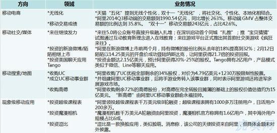 从上图阿里2014Q3财报可以看到,移动交易占比增幅同比已超过200%,Q4在双十一的刺激下,增幅肯定会更明显。如果在结合其他第三方调研机构报告,都能说明阿里在移动端交易体量和占比都是名列第一,且甩开第二、第三的举例不只一两个身段。 阿里即便是移动交易量稳居第一,但来自移动端的压力却日益增大,表现最为明显是来自微信的冲击。外部因素很大的变数来自2014年3月份腾讯战略投资京东,将拍拍、易迅转交京东后,微信和QQ还给了京东一级入口。11月份,腾讯再次出手投资移动电商公司口袋购物。 移动电商层面,阿里面临来自微信小店、拍拍微店、京东微店、口袋购物、口袋通等一系列微商的夹击,尽管后者还未在移动电商形成排山倒海之势,但这种基于移动、社交、碎片化的趋势,正在打破阿里电商生态中依赖搜索的中心化结构。用户在移动购物习惯正发生转变,口碑、分享、推荐疏通了关系链和交易链。一旦这样的用户习惯普遍形成,用户购物体验和海量商品需求比淘宝(天猫)优质时,阿里移动电商的优势地位将不复存在。 当然这些问题阿里早已意识。投资新浪微博除了看重1.5亿的月活用户外,70%的移动日活颇有吸引力。阿里也试图通过打通淘宝与新浪微博用户数据,推出新浪微博淘宝版、微博橱窗\闪购等优化阿里PC电商生态,效果却不尽如意。同样,阿里在陌陌创立早期就已跟投,但上市后的陌陌已先与58同城进行本地信息服务电商的合作,阿里还未出招。不过,从财务层面,新浪微博与陌陌在2014年的上市给阿里带来不菲的回报。 反击微信,阿里在2013年10月推来往时,马云曾多次出来站台,时至2014年,来往却在游戏、在线教育上进发力一番,并未突出移动社交的属性。而双十一当天,阿里集团CEO陆兆禧说:“来往是阿里战术性产品,已达到声东击西的作用” 已经透露出来往未来在阿里的战略地位下降,或成为鸡肋产品。而阿里投美国社交应用Tango会是一场移动社交的曲线救国,谋求海外移动社交领域的话语权。 如果细数投资数量,2014年阿里在移动领域投资案例少于前两年,最大手笔投入在UC和高德的两次全资收购上,两者并入阿里后成立新的移动事业群区别于此前阿里无线事业,移动事业群偏向移动(端)入口的布局。 那为什么阿里还要在现象级移动应用进行投资布局?虎嗅的理解是移动入口的布局是为阿里电商、O2O等业务做基础建设,手机淘宝、天猫无线这些APP除了交易本身,其产生的附加值是有限的,用户使用频率和时间不足以支撑阿里业务层次的延展。 金融业务——大而不倒