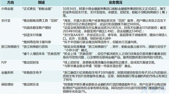 “有时候,打败你的不是技术,可能只是一份文件。”这句话是马云在2014年3月份间接回应央行叫停支付宝虚拟信用卡产品及二维码支付时所说,而此前四大行陆续下调支付宝快捷支付转账限额。远一点再到三年前的支付宝VIE事件,无不体现阿里金融业务壮大的一路上,各方博弈伴随而来的现状。 但无论如何,今天阿里的金融业务(现已统一整合更名为“蚂蚁金服”)已发展到了难凭一纸文件就封杀所有出路的规模与影响力了。其成长只是时间问题、速度问题。 2014年,余额宝的散户理财霸道地位已经巩固,天弘基金已成为国内最大额货币基金。娱乐宝以保险理财之名,做影视众筹之实先后推出四期。小微金服更名“蚂蚁金服”后,业务梳理正向多元化方向尝试,推出赊账消费产品“花呗”PK京东“白条”,而之前小贷业务只面向商家。定期,约定年化收益的个人理财产品招财宝批低风用来吸引一批低风险偏好的投资者。 支付宝加快了向线下便利店、停车场、医院等渗透,不断丰富线下应用场景,抢占市场份额外,获取线下交易行为数据,为O2O业务埋下伏笔,可以预见2015年还会加速。 阿里金融业务在用户和商户两端渗透之外,2014年在第三方金融机构方面布下棋子,33亿收购恒生电子,马云是背后实际控股人。恒生电子的角色类似金融TI信息服务民工,80%的市场占有率,可见阿里在中国金融体系中的角色正变得举足轻重。此外,在2014年9月29日,蚂蚁金服牵头筹建的浙江网商银行获得了银监会第二批发放的民营银行牌照,第一批中的腾讯银行(微众银行)在12月28日上线,“阿里银行”会成为2015年一大看点。 关于阿里蚂蚁金服的上市问题,马云2014年双十一做过回应,“由于多种原因,阿里巴巴没有办法在A股上市,希望未来支付宝能够在中国A股上市 。”不过,应该不在2015年。 云生态体系——“云”积“端”发
